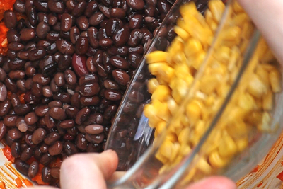 Dodamo odcejen rdeči in črni fižol ter koruzo. Vse sestavine nežno premešamo.