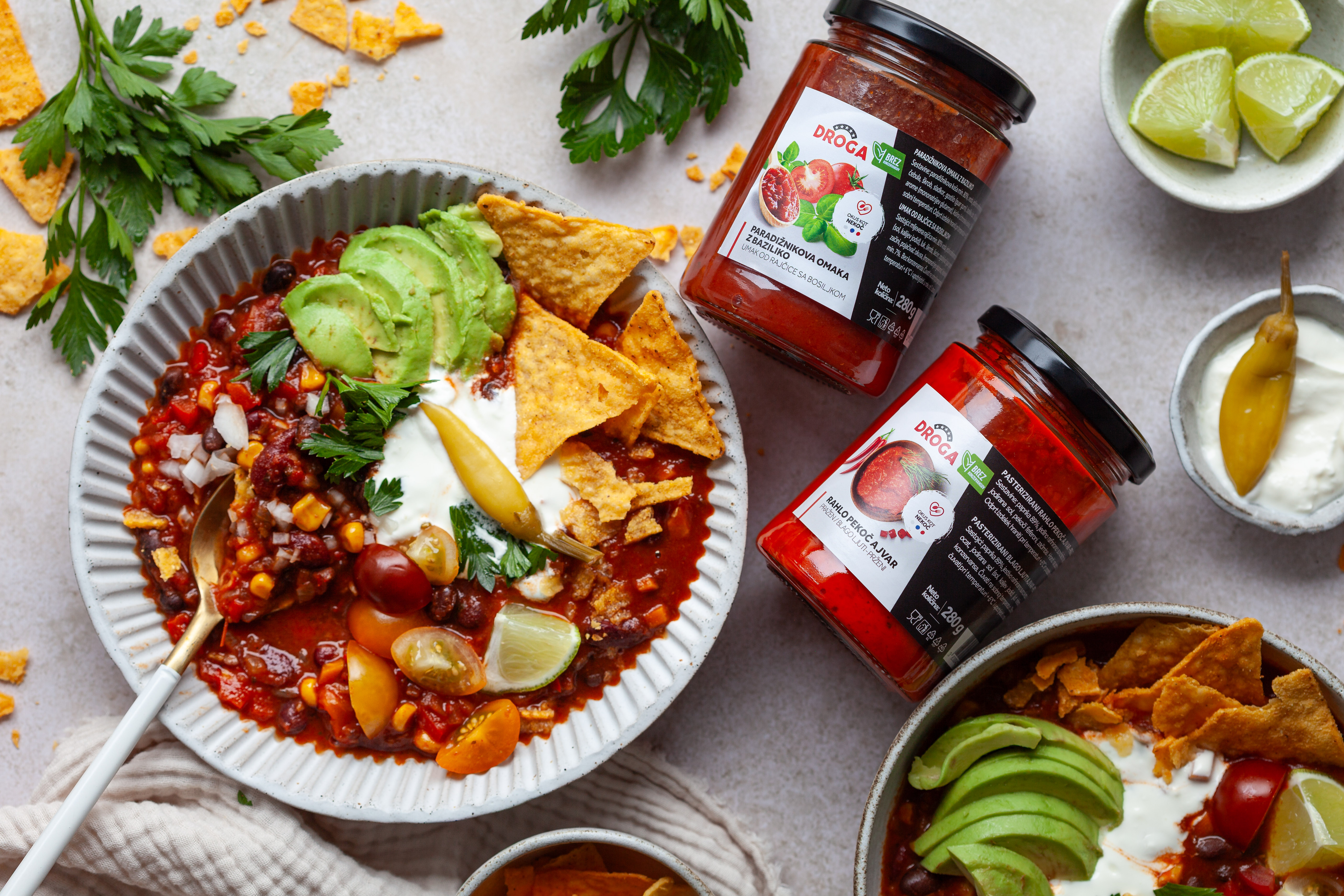 Kaj najbolje pogreje na hladen dan? Krožnik bogatega brezmesnega čilija, poln okusa in pisanih barv, bo prava stvar! V njem se skrivajo fižol, koruza, paprika, začimbe in nepogrešljivi izdelki iz ozimnice – rahlo pekoči ajvar DROGA, paradižnikova omaka z baziliko DROGA in še pekoči feferoni DROGA za piko na i. Postrežemo s kislo smetano, svežimi zelišči in tortilja čipsom!
