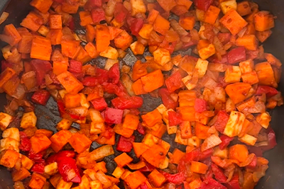 V loncu segrejemo olivno olje, na katerem popražimo čebulo, na kocke narezano papriko, korenje in zeleno. Pražimo nekaj minut, nato dodamo začimbe in paradižnikov koncentrat ter nadaljujemo s praženjem.