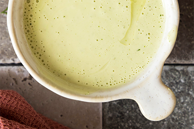 Najprej zmiksamo vse sestavine za preliv, razen fete. Nato dodamo še feto in še enkrat vse zmiksamo v kremni preliv.