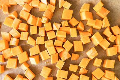 Sladki krompir olupimo in narežemo na kocke. Prenesemo ga na pekač, obložen s papirjem za peko, pokapljamo z oljem, soljo in poprom ter premešamo. Pečemo 30 minut na 200°C, vmes enkrat previdno premešamo.