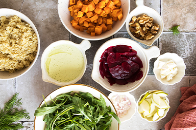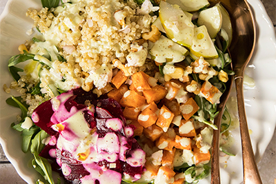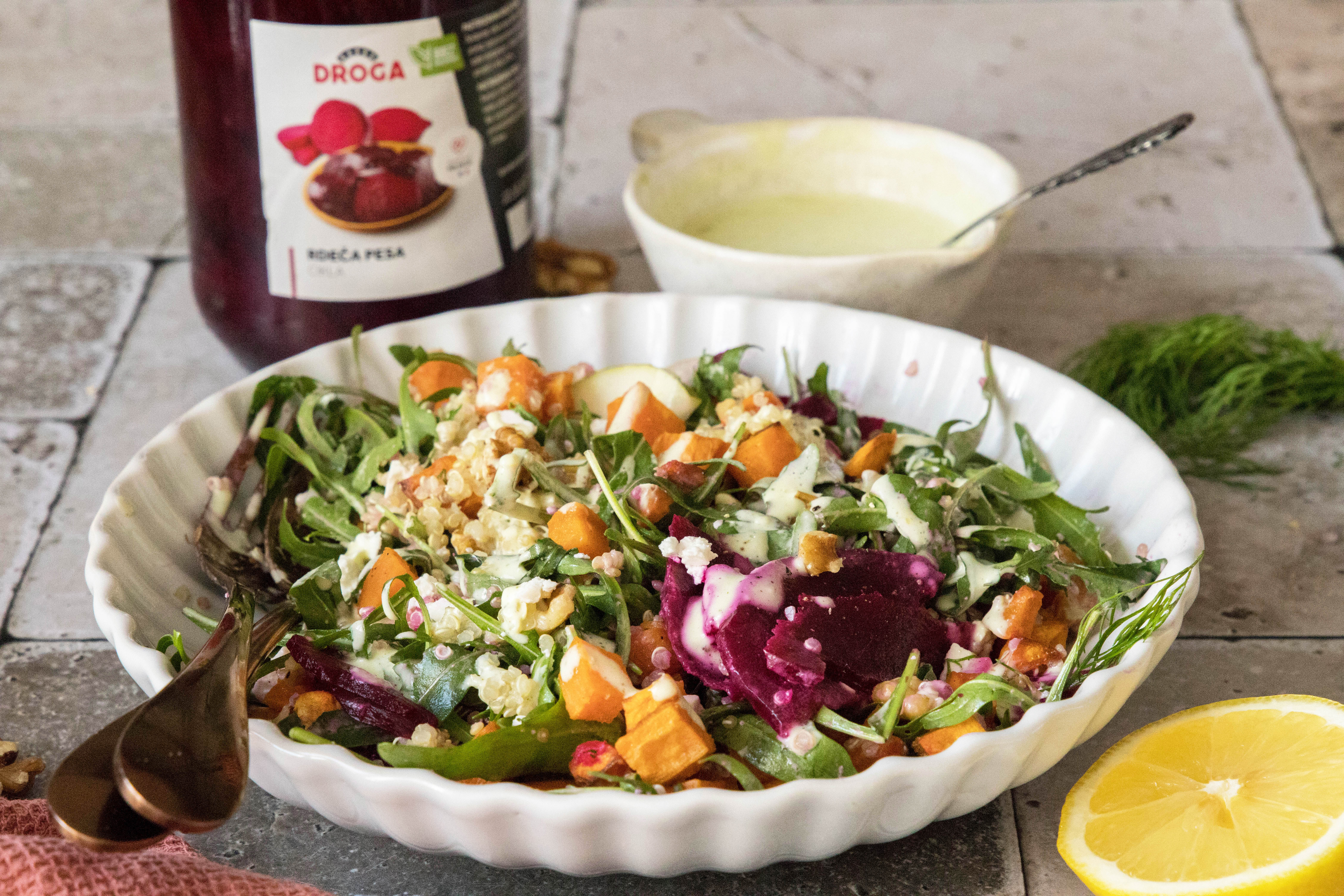 Kvinojina solata s pečenim sladkim krompirjem, rdečo peso in fetinim prelivom
