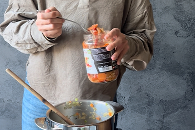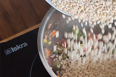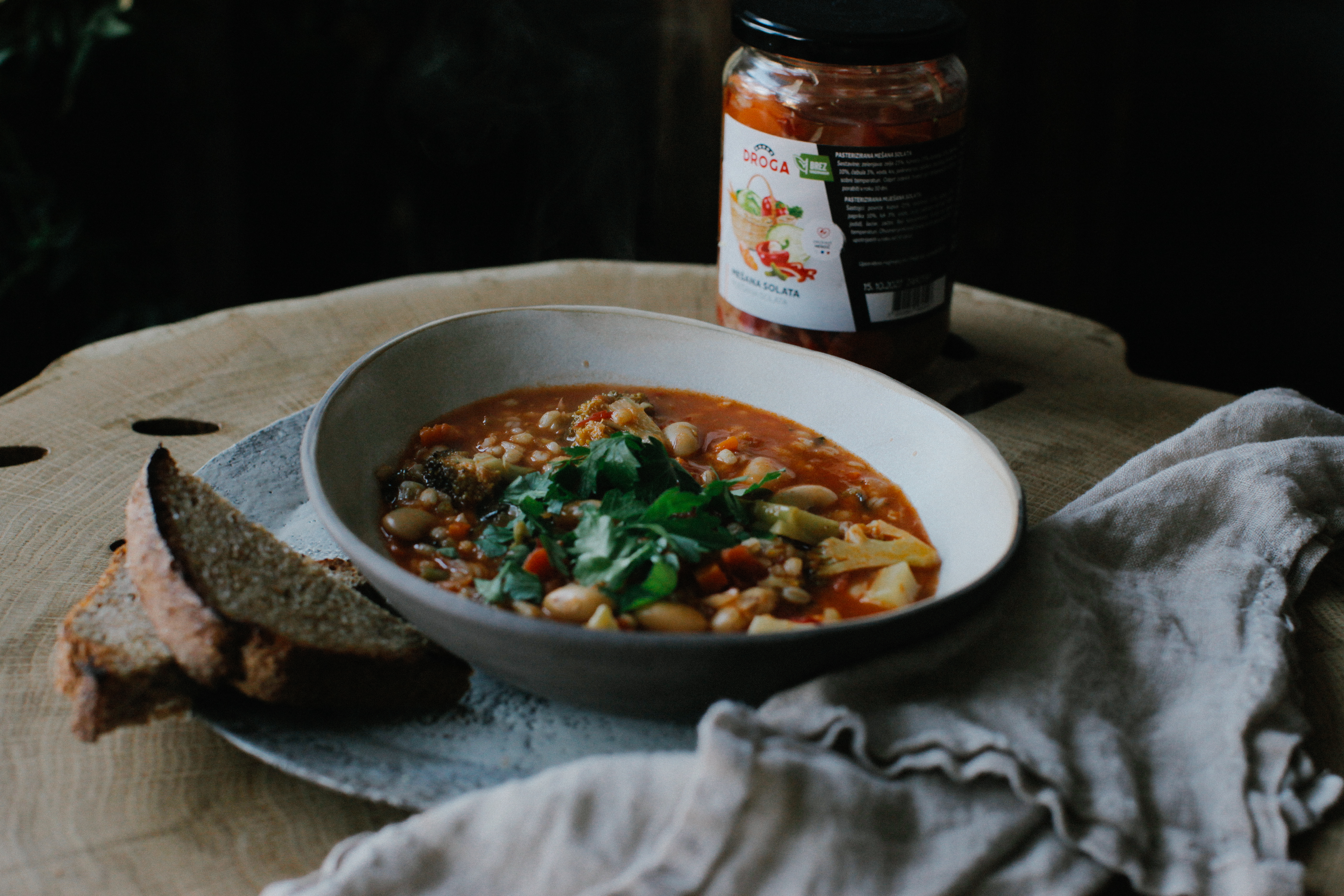 Topla, gosta juha med ričetom in mineštro - polna ješprenja, zelenjave in fižola, ki je zelo preprosta in pogreje telo na hladne deževne dni. Narejena na malo drugačen način z mešano solato DROGA, ki ustvari popolno ravnovesje med kislim in slanim.