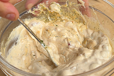 V skledi zmešamo grški jogurt, namaz s papriko in kumaricami DROGA, drobnjak, limonin sok in olivno olje.