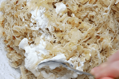 V večji ponvi segrejemo 1–2 žlici olja, dodamo sesekljano čebulo in jo prepražimo, da postekleni. Dodamo na kocke narezan krompir, začinimo s soljo in poprom ter na zmernem ognju med mešanjem pražimo 10–15 minut, da se krompir zlato zapeče. Dodamo odcejeno kislo zelje DROGA in pražimo še 5 minut. Nadev ohladimo na sobno temperaturo, nato vmešamo 2 zvrhani žlici kisle smetane.